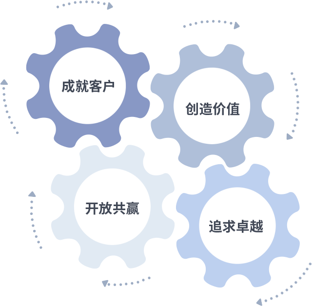成就客户是一切决策的出发点,创造价值是衡量所有工作的标准,追求卓越是888集团做事做人的态度,开放共赢是888集团的格局也是最终的结果。价值观的齿轮环环相扣,推动着组织里的每个人不断向前。
